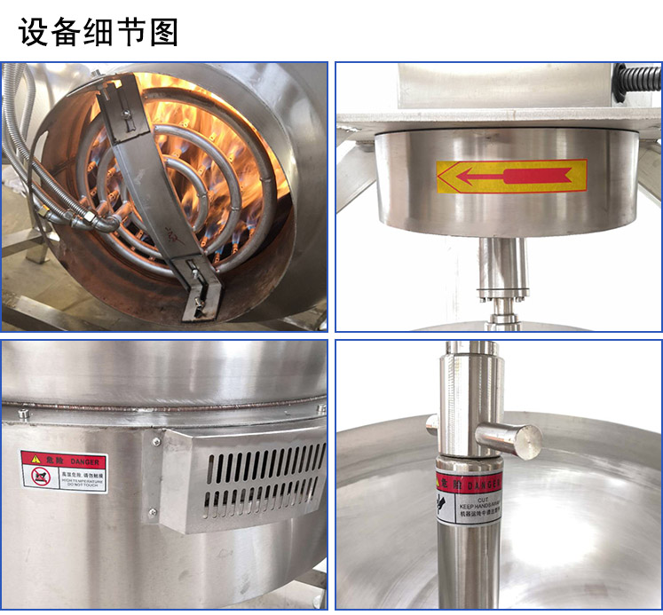 本設備鍋體內膽采用宜興北海一次沖壓成型的半球體不銹鋼鍋鍋體,整體圓度誤差小,攪拌器與鍋體貼合度高,避免糊鍋現象出現。本產品以液化氣、天然氣為熱源,使用方便,燃燒充分,無煙塵,環保無污染,耐磨耐高溫、無毒,符合食品要求,采用無極變頻調速,攪拌轉速變頻細節,能使液壓推力使攪拌臂翻轉,再利用液壓推力傾翻鍋體,免拆裝攪拌器,易于進出原料,節省人力。