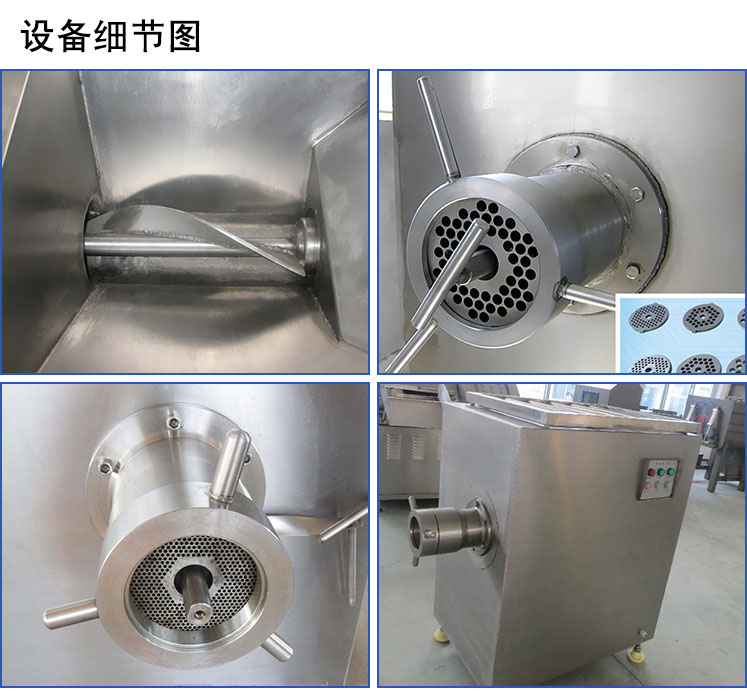 絞肉機為系列產品:工作時利用轉動的切刀刃和孔板上孔眼刃形成的剪切作用將原料肉切碎,并在螺桿擠壓力的作用下,將原料不斷排出機外。可根據物料性質和加工要求的不同,配置相應的刀具和孔板,即可加工出不同尺寸的顆粒,以滿足下道工序的工藝要求。